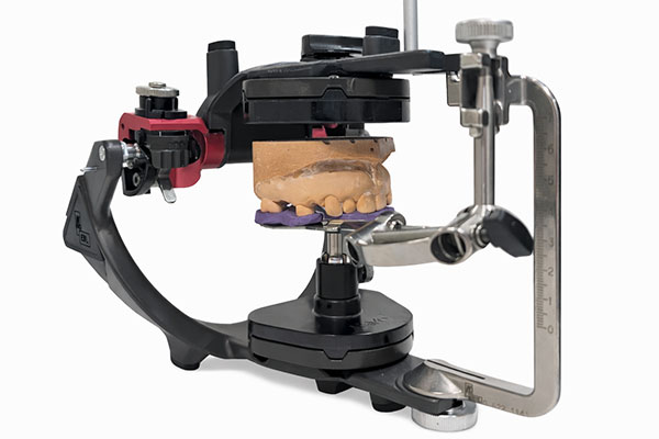 当院では、ドイツKaVo社製の咬合器とフェイスボーを使用し、患者さま一人ひとりの顎の動きを精密に再現した上で義歯を製作します。フェイスボーにより、上顎と頭蓋の位置関係を正確に記録し、咬合器上で実際の顎運動を再現することで、